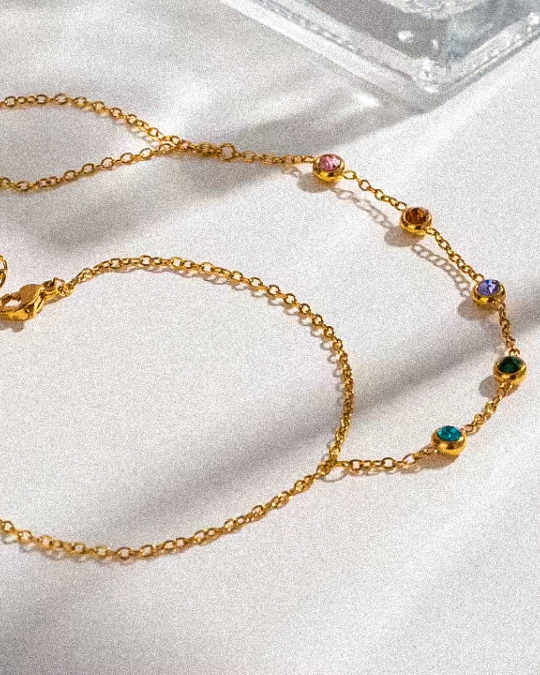 Five radiant gems fall like sunlight on your skin — each one glowing with a different shade of a perfect sunset. Inspired by the colors of Positano at golden hour, this hand chain is designed for sun-kissed moments and barefoot elegance.